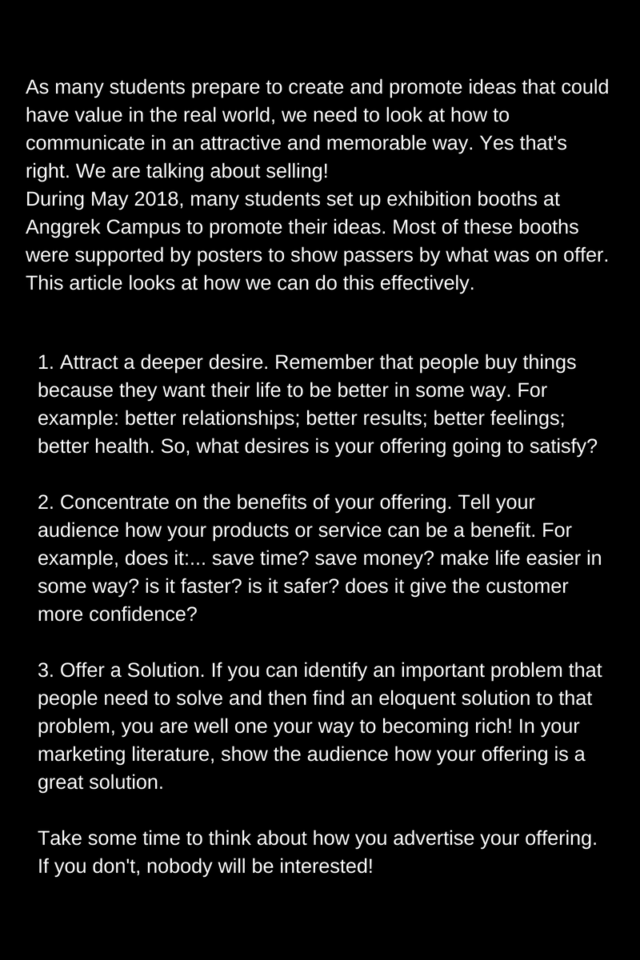 Tips To Write Posters. Articles BINUS students are encouraged to think of new ideas that have commercial potential. This article suggests some things that you need to think about when you communicate your ideas to the public. Please read! Share It :