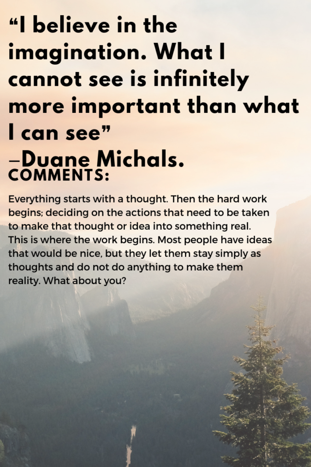 Comments: Everything starts with a thought. Then the hard work begins; deciding on the actions that need to be taken to make that thought or idea into something real. This is where the work begins. Most people have ideas that would be nice, but they let them stay simply as thoughts and do not do anything to make them reality. What about you?