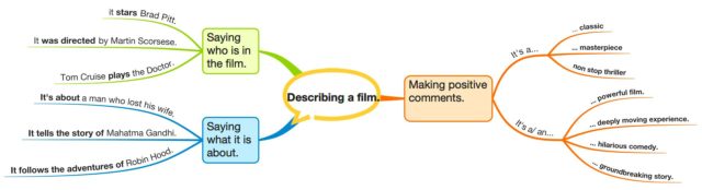 Talking about films is a topic that often comes up in conversations. This mind map gives you a few tips about what you can say. You can talk about: