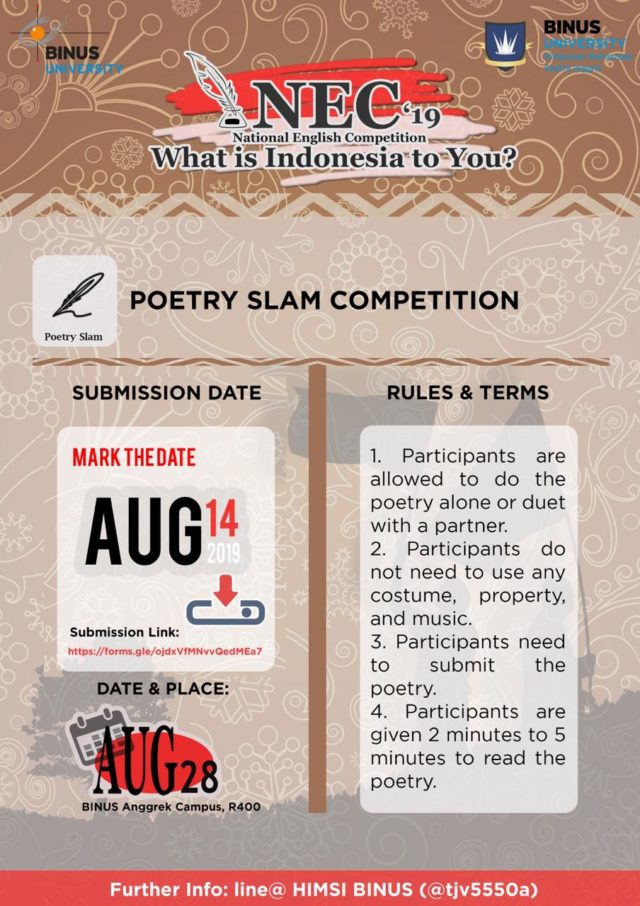 Let’s lift the hearts of our audience with poetry! Poetry is still alive and kicking at BINUS! This is your chance to express your thoughts and feelings and move others.
