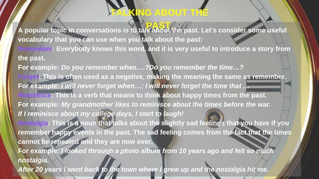 A popular topic in conversations is to talk about the past. Let’s consider some useful vocabulary that you can use when you talk about the past: