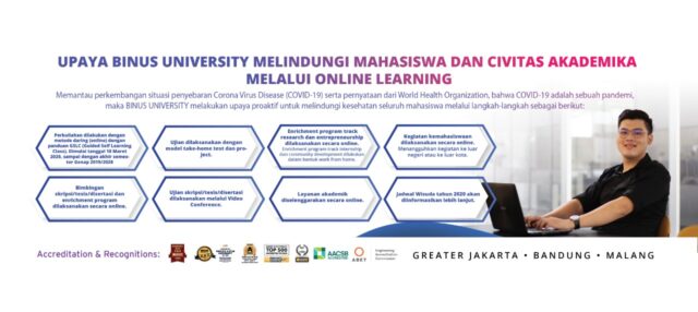 Seluruh informasi resmi dari BINUS University akan disampaikan melalui portal mahasiswa (Binusmaya). Tetap waspada dan terus mengikuti perkembangan informasi terkait COVID-19 dari sumber-sumber terpercaya yang dikeluarkan oleh Pemerintah RI. Source: https://binus.ac.id/2020/03/upaya-binus-university-melindungi-mahasiswa-dan-civitas-akademika-melalui-online-learning/