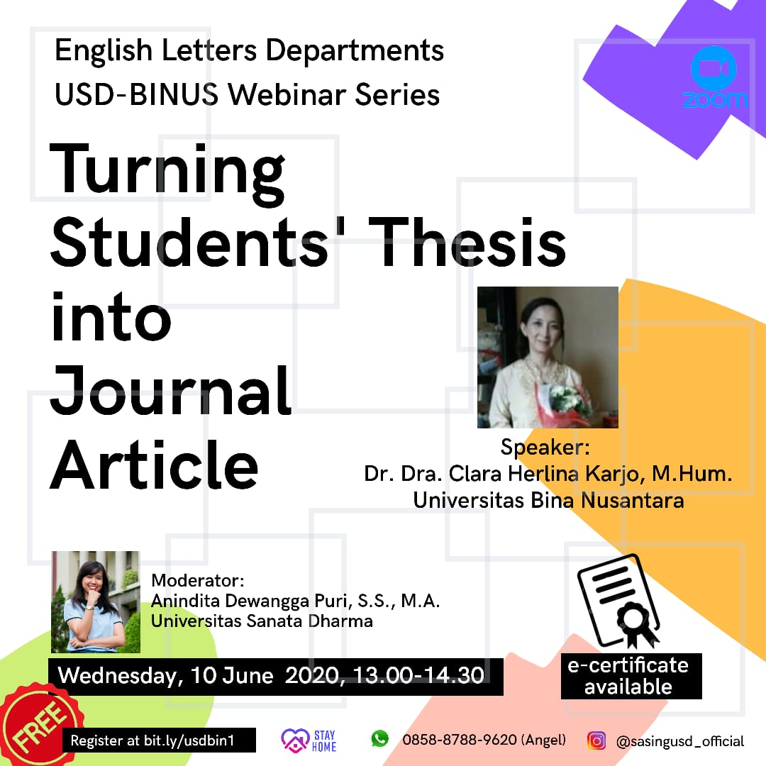 As part of our collaborative agreement with Sanata Dharma University’s English department, our very own Dr. Clara Herlina will speak in a webinar that was prepared for Sanata Dharma students. She will share her experience and expertise on turning students’ thesis into journal articles.