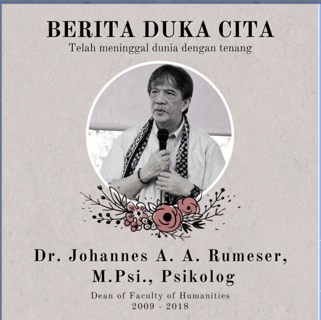 English Department BINUS University would like to extend our condolences on the passing of Dr. Johannes A. A. Rumeser, M.Psi., Psikolog (Pak Jo). He passed away at the age of 71 on Sunday, December 6 2020 at 2:00 WIB.