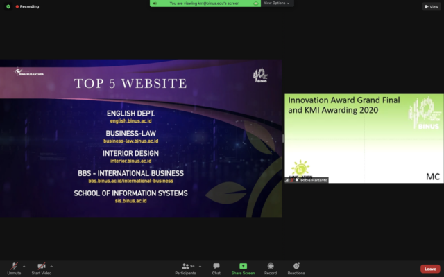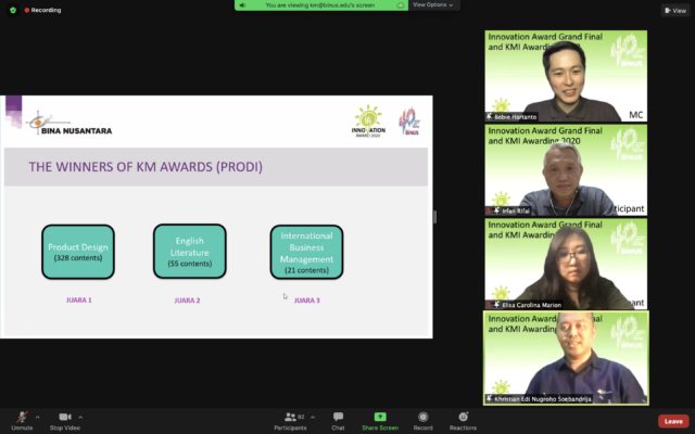 What a year it has been for our department which received two awards for top 5 website for its content and the 2nd winner for the number of digital content created in 2020. The awards were given to Irfan Rifai and Elisa Carolina as representatives from English department and Faculty of Humanities, on a special ceremony held by Binus Knowledge Management Directorate in December 2020.
