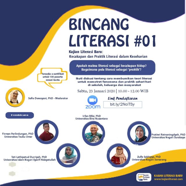 #Sobat Literasi, ikuti bincang santai tentang teori literasi terkini. Mari berdiskusi bersama peneliti-peneliti yang akan berbagi tentang kajian literasi yang mereka lakukan untuk memotret fenomena dan praktik literasi dalam keseharian.