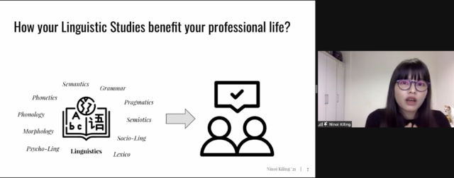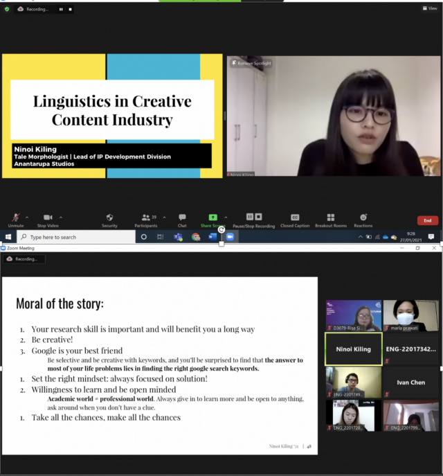In the world’s current condition where most interaction are held online, there are out flowing webinars available that embrace interesting topics to help people learn new things despite the pandemic. And being one of the students in the alternative internship track program, I am fortunate to have an opportunity to participate and learn new things in the webinars well-prepared by some of the outstanding professionals as the speakers. In fact, it has been a fun and informative learning journey as where I had come to the last webinar on the program track. It was about ‘Linguistics in content creative industry’ presented by a tale morphologist from Anantarupa Studios, Ms. Ninoi Kiling. At first, I do not have any exact idea on what it is specifically about. Then, after taking some guess, I thought it could be about a story writer for books or any other reading medias. Yet eventually after some minutes being in the webinar, I caught something more exciting and interesting than what I have thought beforehand. It is not only about writing on various reading materials, but also on interactive medias such as film, animation or even game production. In my part, it is a refreshing webinar topic to have taking part in where it gives new perspectives to us students. Additionally, Ms. Ninoi only did not teach us the technicalities but also motivate us to achieve our target career in the future.