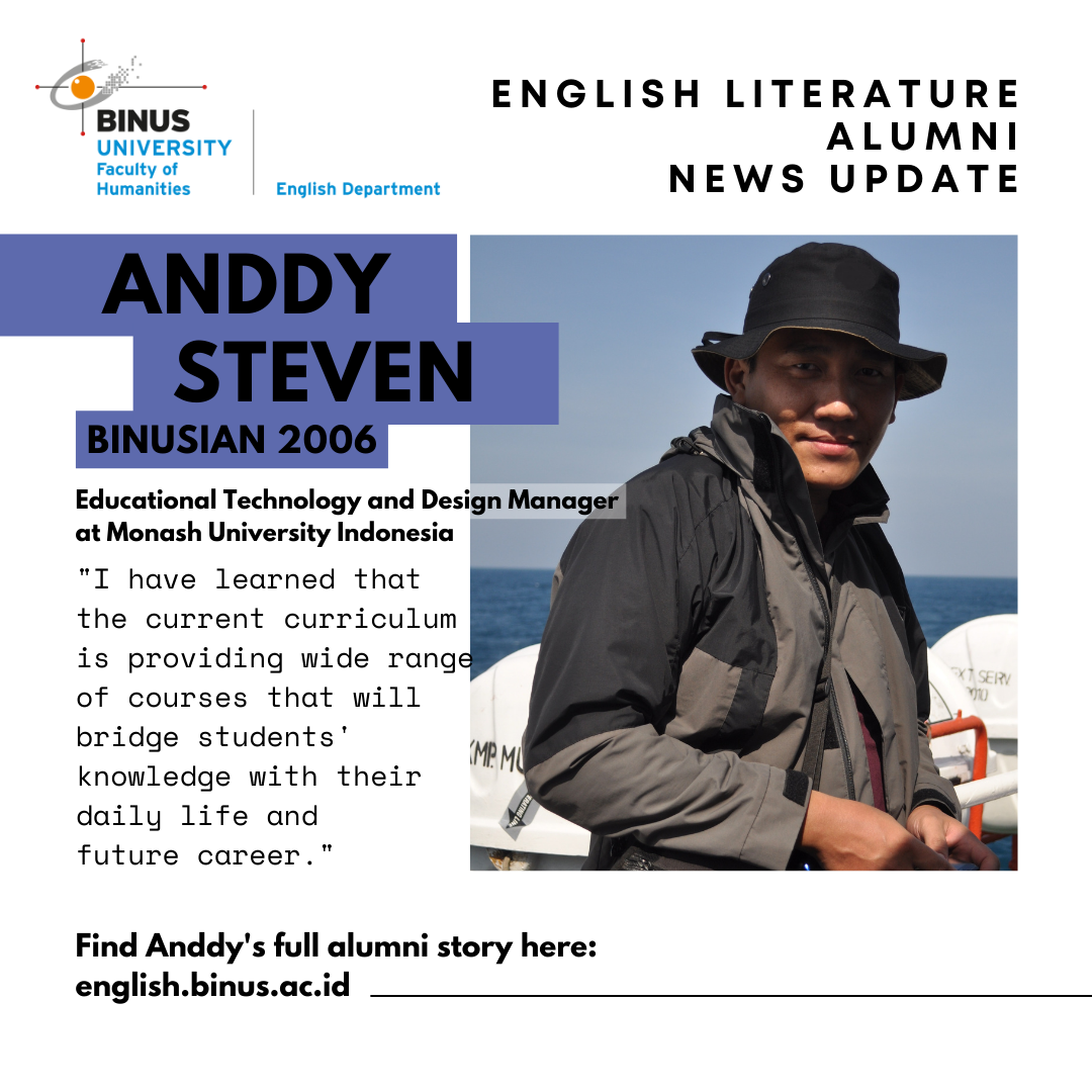 I believe that learning English can be a door to learn other disciplines and field. Back in 1999, I chose the BINUS University’s English Department because at that time the department provided a wide range of courses that could enhance not only my English skills but also my cultural aspects and understanding of the language. I have learned that the current curriculum is providing wide range of courses that will bridge students’ knowledge with their daily life and future career.