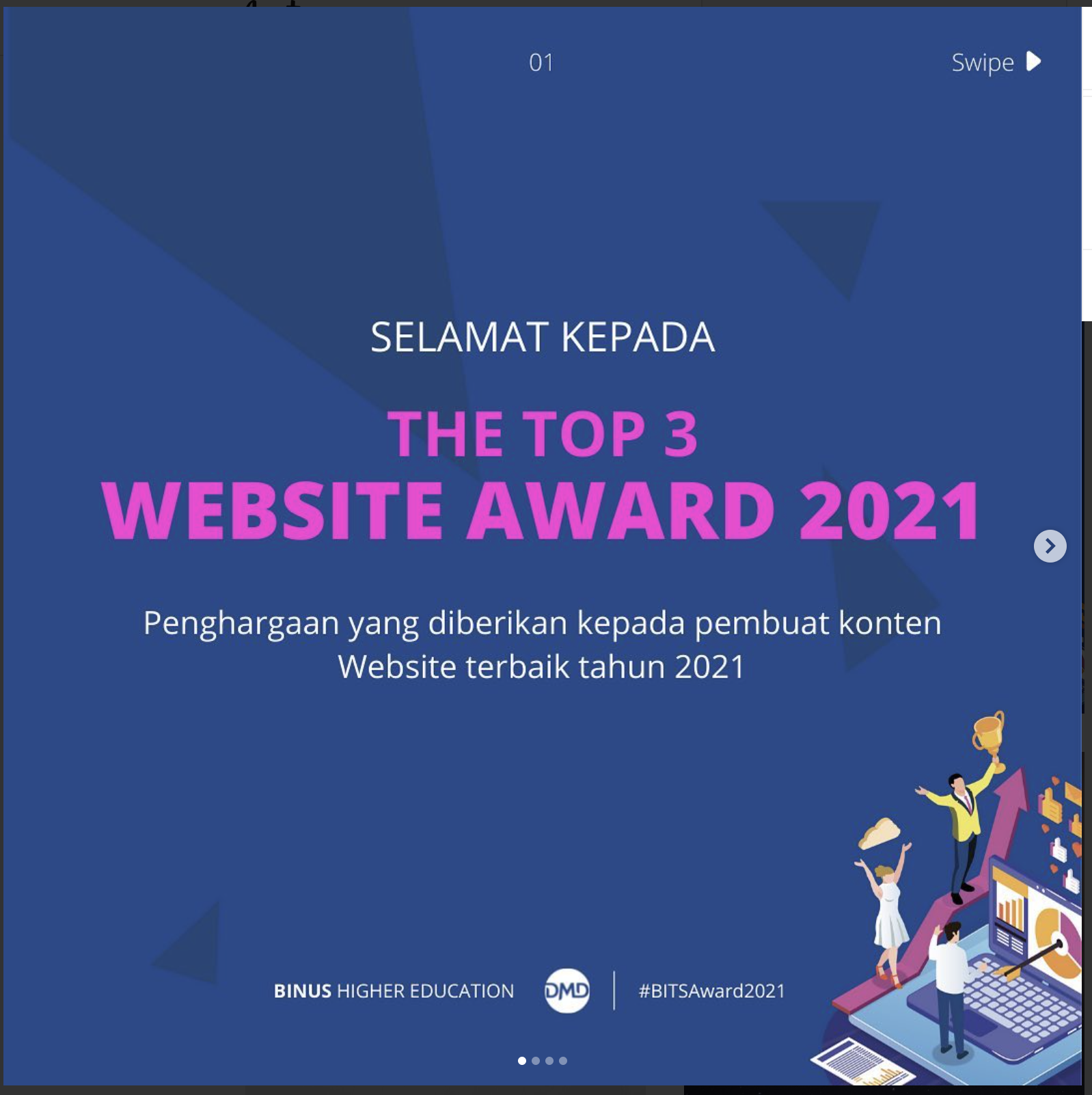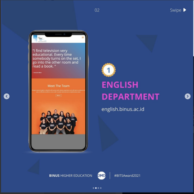 Representing the English department team, our head of department received an award for Best Website Content Creator on December 10, 2021, following the commitment of our team in creating quality content for our website’s post. Thank you DMD team for the support and The Binus Knowledge Management Directorate for the acknowledgment.