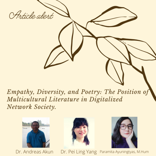 Poetry is more than just a literary expression. It may produce empathy and cultural competence vitally needed to navigate today’s digitalized network society when cultivated in the right way. This paper elaborates empathy on diversity through poetry. This is a qualitative research conducted in two layers of analysis: textual analysis of the poems and analysis of students’ responses on the empathy and diversity issues. The two poems on diversity are an Indonesian poem I See Indonesia by Soekarno and a Taiwanese poem Song of the Island by Chen Li. 75 respondents from English Department of Bina Nusantara University, Jakarta Indonesia and Aletheia University, New Taipei-Taiwan were involved. The results show that the two poems have reflected and produced empathy both in the authors and the readers. It is also concluded that poetry is utilized beyond its literary function in navigating diversity through cultivating empathy in studying poetry and multicultural literature as the research has proven that almost all (96.66%) of Indonesian students agree that multicultural literature helps them develop their CQ (Cultural Quotient/Competence) and 86.66% of Taiwanese students also agree and believe the same. Most of them finally believe that CQ positively contributes to their preparation of their future profession.