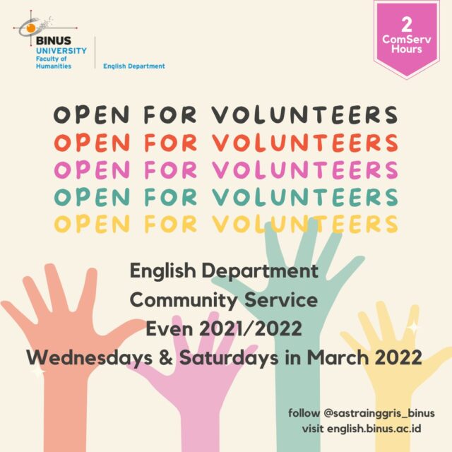 The English department opened volunteers recruitment for Community Service activities this March 2022. 12 students have volunteered as administrators and material for the community development activities that involve knowledge sharing. We will keep you updated with how the volunteers plan and excute the actitivities.