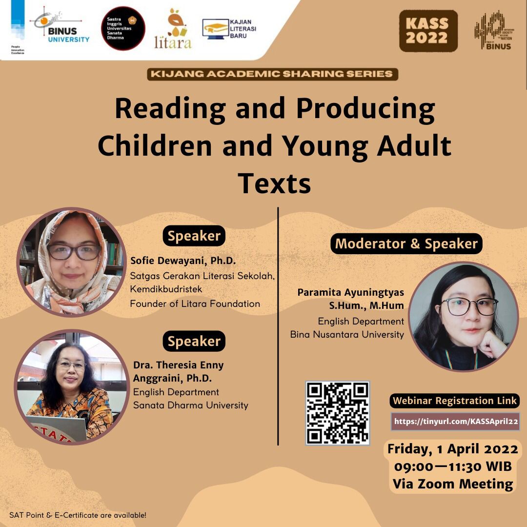 Please join our first Kijang Academic Sharing Series ( KASS) in 2022. For the upcoming webinar, we are excited to have the likes of Dr. @sofiedewayani , Dr. @ennyar27, and our very own Ms. Paramita Ayuningtyas, to share their in-depth knowledge and experience in reading and producing children and Young Adult books. It’s open to all binusians and public. Let’s join the webinar and the conversation! #sastrainggrisbinus