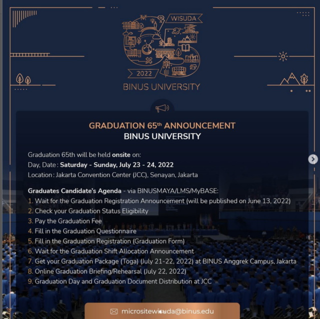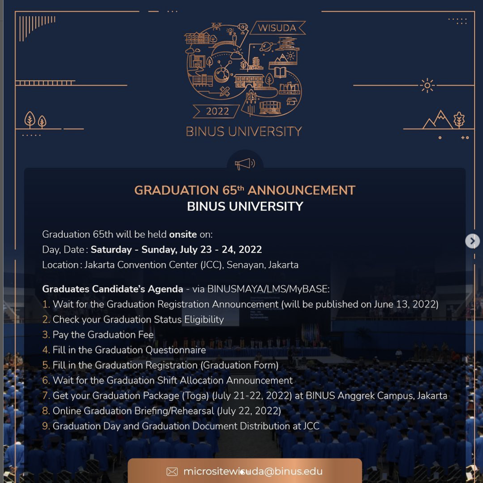 Graduation 65 Ceremony Activities & Events Agenda Hi Seniors! It’s finally back offline! After two years of online graduation ceremonies, Binus has returned the graduation ceremony offline. Register for the once-in-a-lifetime experience and see you all at JCC! Share It :