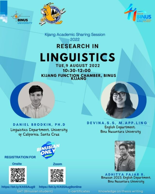 Kijang Academic Sharing Series (KASS) #3, will have Daniel Brodkin, Ph.D., and Devina, M.App.Ling. as notable experts in Linguistic Research.