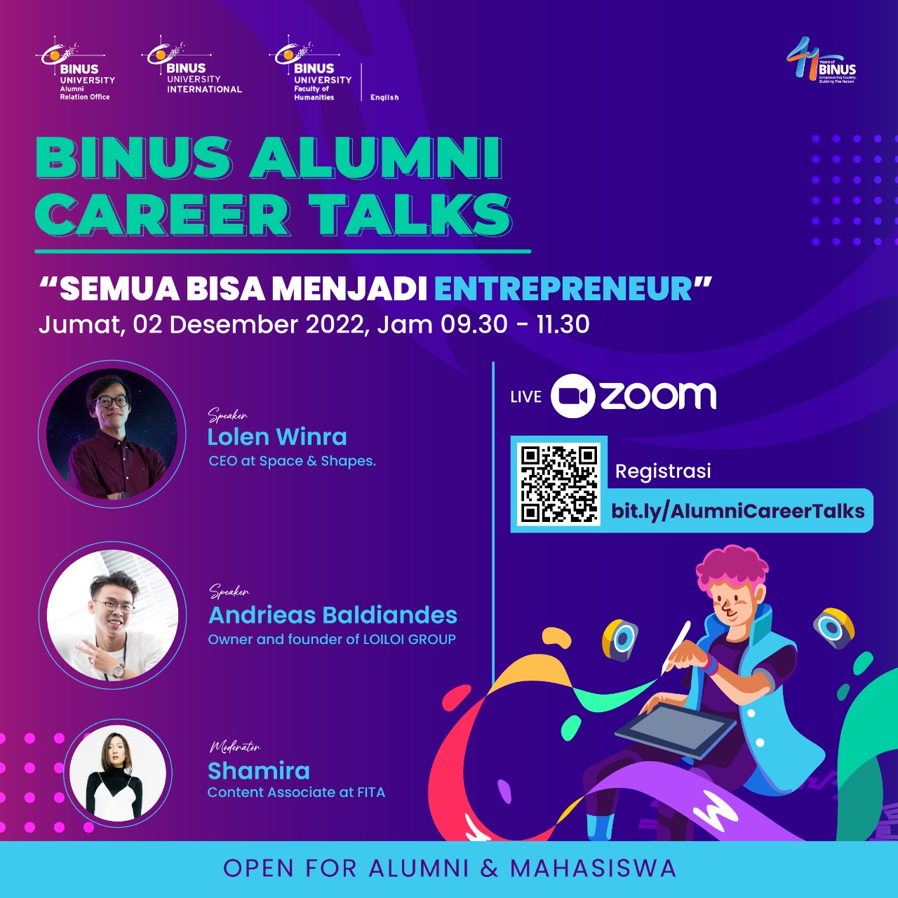 BINUS Alumni Relation Office, BINUS International, English Department BINUS University mempersembahkan Webinar BINUS Alumni Career Talks dengan tema Semua bisa menjadi Entrepreneur yang akan diselenggarakan pada: