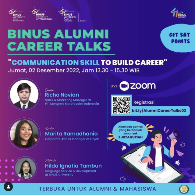 BINUS Alumni Relation Office, BINUS International, English Department BINUS University kembali mempersembahkan webinar *Binus Alumni Career Talks* Dengan tema *”Communication Skill to Build Career”*