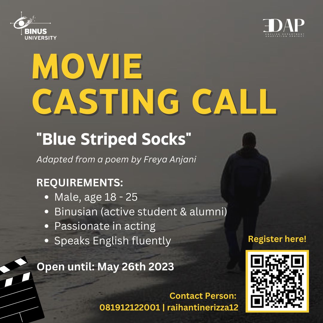 English Department Adaptation Project, mostly known as EDAP is opening another casting in search of a talented and committed actor to play one of the protagonists in their second short film. The short movie is going to be an adaptation of a romantic story written by Radikha Freya Anjani. The short movie will focus on the story of a blue stripped sock, which for some, an ordinary thing; However, for a special one, it is a keepsake, a symbol for the couple’s memories and hope for their return. The team is looking for a male actor to play the role of Austin, the boyfriend character. Depicted as a quiet and chill individual which can also be easily triggered to intense emotional outburst.