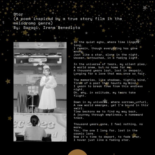 Let us present you the first winner of 2023’s Potery Writing Competition . “Star”, by Irene Benedicta Saragi. In winning the first prize, Irene’s poem outclassed other poems written by hundreds of other participants nationwide. Enjoy!