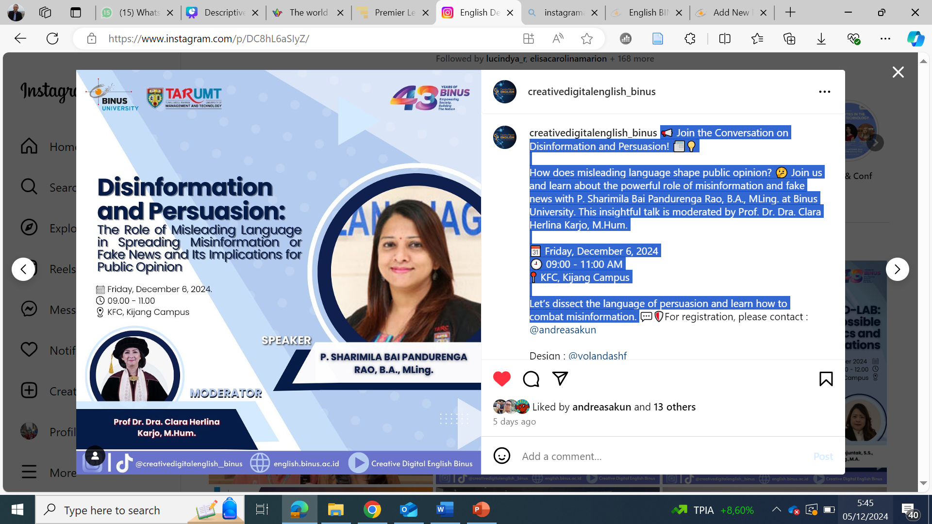 Join us and learn about the powerful role of misinformation and fake news with P. Sharimila Bai Pandurenga Rao, B.A., MLing. at Binus University. This insightful talk is moderated by Prof. Dr. Dra. Clara Herlina Karjo, M.Hum.