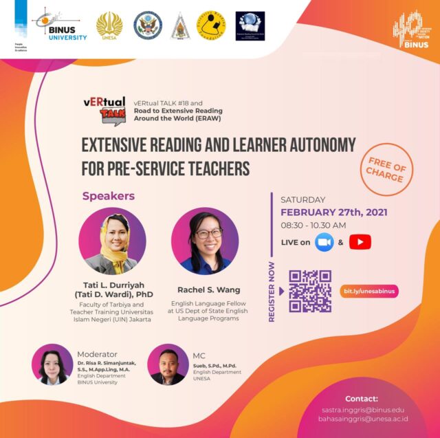 We are happy to announce that our vERtual Talk #18 is back! We are delighted to invite you to join an in-depth discussion on autonomy teaching for pre-service teachers with our speakers: Tati L. Durriyah (Tati D. Wardi), P.hD. (UIN Jakarta) and Rachel S. Wang (English Language Fellow at US Dept. of State English Language Programs).